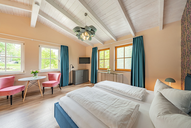 Besonders ruhig liegt unser romantisches Doppelzimmer im Obergeschoss des Nebengebäudes. Vom kleinen Balkon blicken Sie auf unseren naturbelassenen Garten und vom Schlafzimmer hinunter auf den berühmten Malerweg.