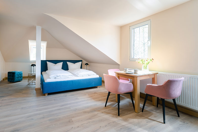 Im Dachgeschoss des Hauptgebäudes bietet unser romantisches Studio einen herrlichen Ausblick über unseren naturbelassenen Garten bis zum Tafelberg Gohrisch. Der offene Wohn- und Schlafbereich integriert eine kleine Küche mit zwei Kochfeldern, kleinem Kühlschrank, Kaffeemaschine sowie Geschirr und Spülbecken.