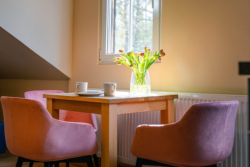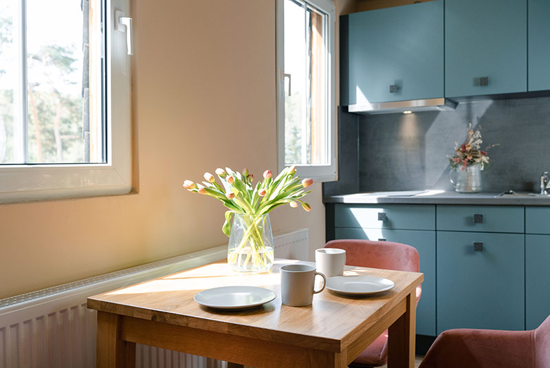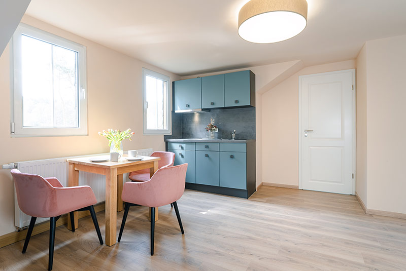 Die gemütliche Einrichtung im Landhausstil und die moderne Ausstattung samt Esstisch sind für den Aufenthalt von zwei Gästen ausgelegt. Bei Bedarf sind Aufbettungen für bis zu zwei Personen möglich.