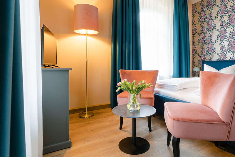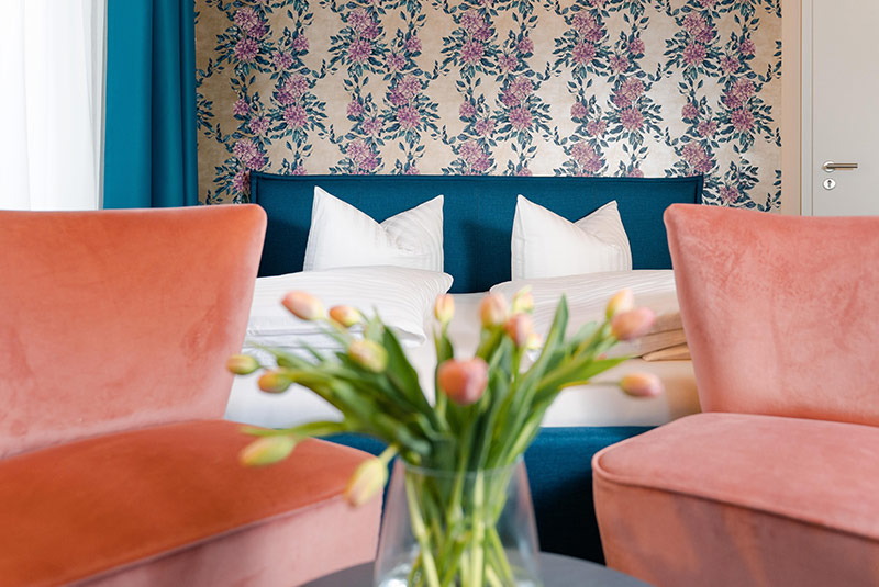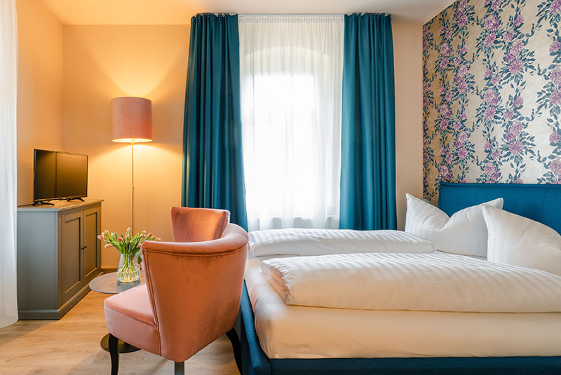 Von unserem Familienzimmer im Obergeschoss des Hauptgebäudes haben Sie einen herrlichen Ausblick auf unser naturbelassenes Grundstück bis zum Lilienstein. Mit zwei separaten Schlafzimmern, Balkon und Tageslichtbad bietet die Wohneinheit großzügigen Platz auf rund 40 Quadratmetern.